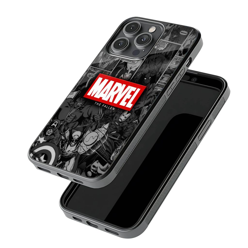 Marvel Comics Glass Case featuring iconic superhero artwork, durable tempered glass protection, slim lightweight design, precise cutouts, scratch resistance, shock absorption, and vibrant high-definition print for stylish everyday phone protection.
